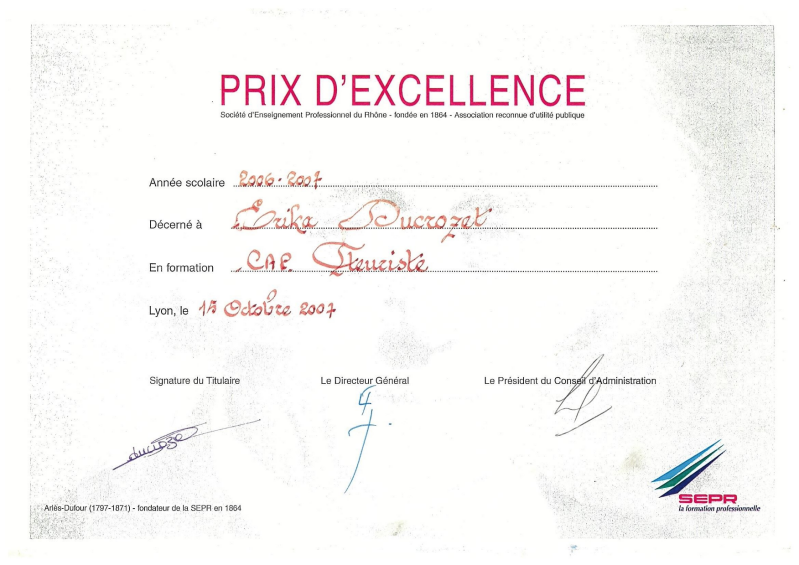 CAP et prix d'excellence fleuriste, obtenu à la SEPR de Lyon. Niveau BP obtenu